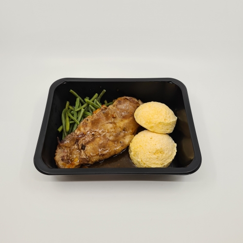 Cuisse de poulet CH au four, semoule de blé, haricots verts