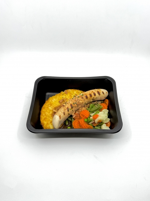 Saucisse de veau et porc CH sauce oignons, rösti, jardinière de légumes