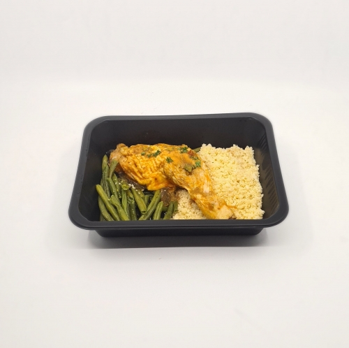 Cuisse de poulet CH, épices, oignons, moutarde, paprika Vin blanc cuit, huile de colza, ail Semoule de blé, haricots verts, GLUTEN Assaisonnement, sel