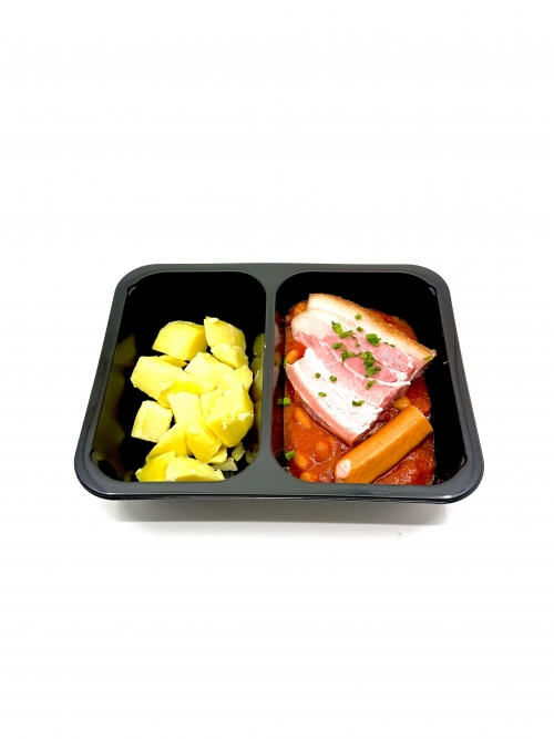 Haricots de soissons sauce tomate, basilic, pommes nouvelles rôties