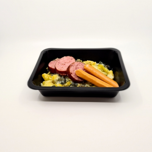 Pommes de terre, poireaux, laurier, épices Lait ( Lactose ), farine ( Gluten ), vinaigre Saucisson de porc CH, vienerli CH, saumure Assaisonnement, sel