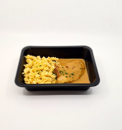 Veau CH, épices, huile de colza, beurre, épices, oignons, ail Aromate, herbes, poivre rose, vin blanc cuit, Fond de viande, crème entière ( Lactose ) Pâtes ( Semoule de Blé, eau, sel ) Gluten, ciboulette Assaisonnement, sel