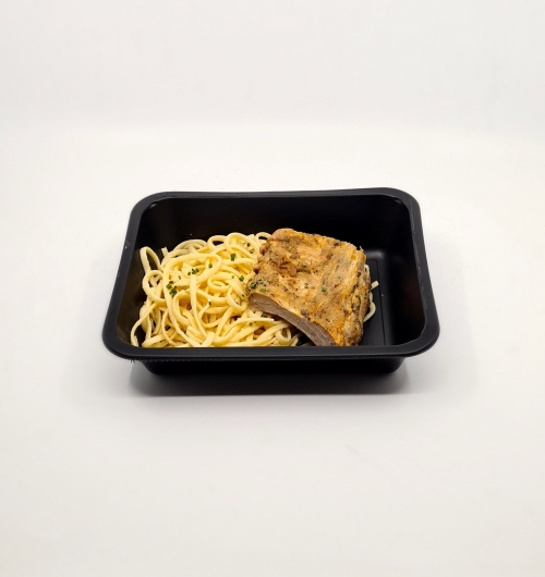 Travers de porc CH, paprika, curcuma, épices, ail, poivre Linguini ( Semoule de blé, eau, sel ), GLUTEN, huile d'olive Assaisonnement, sel, ciboulette